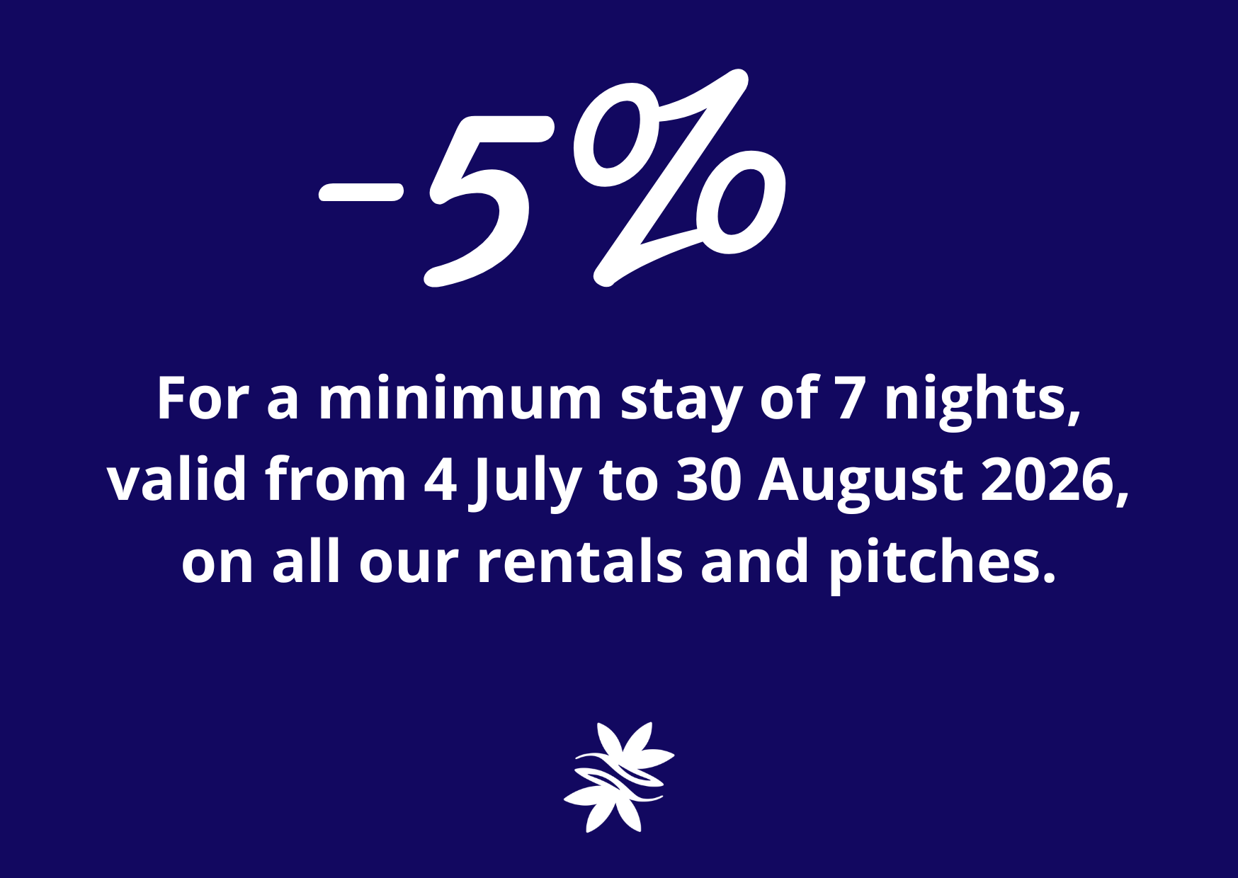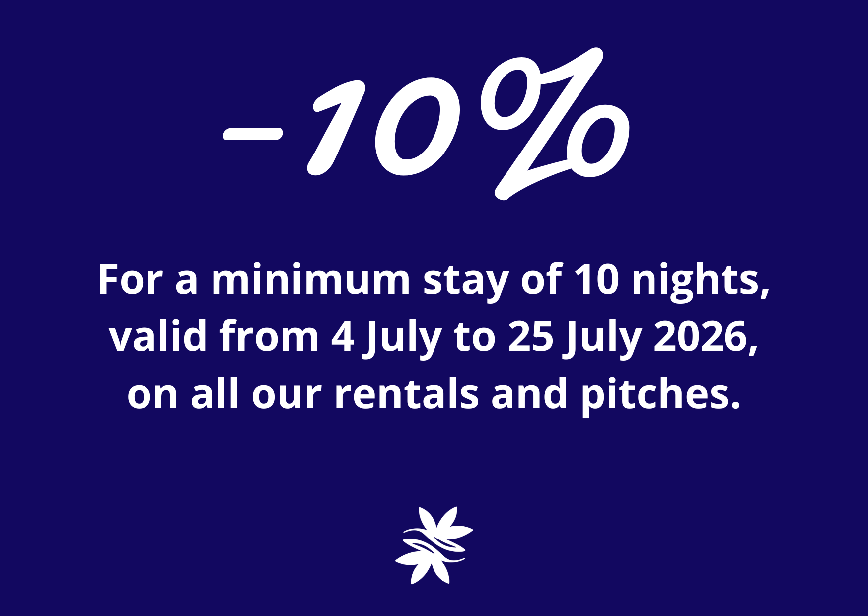 Take advantage of our offer on: our wooden cottages, our canvas and wooden lodges, our tent pitches, van pitches and motorhome/caravan pitches.